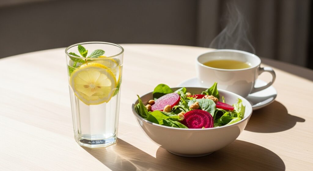For a cleansing boost, try warm water with lemon in the morning or herbal teas like ginger, dandelion, or mint.