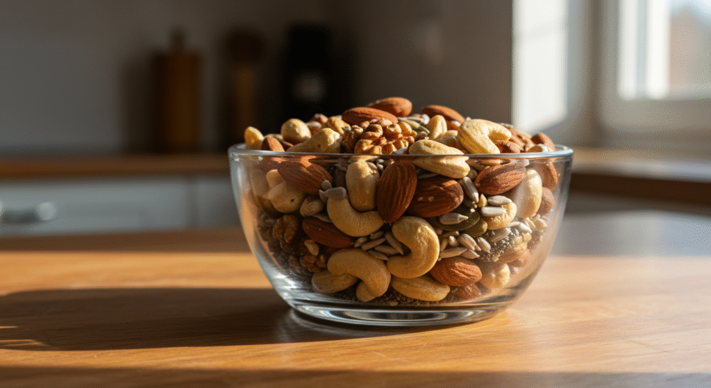 Nuts, almonds, and cashews are rich in healthy fats, magnesium, and tryptophan — nutrients that help produce cellular energy and regulate mood. Magnesium, in particular, is essential for turning glucose into ATP, the body’s primary “energy currency.”